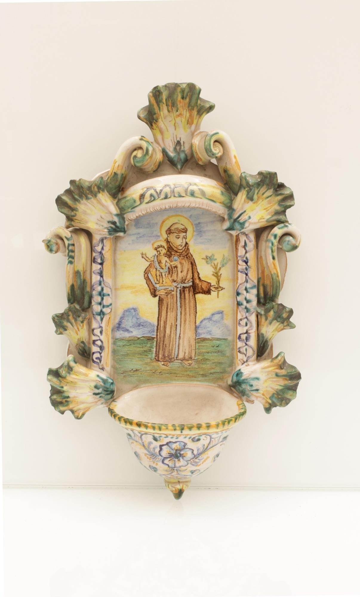 Manifattura di Ariano Arpino. Acquasantiera in maiolica decorata con l'immagne di Sant'Antonio Abate e il Bambin Gesù