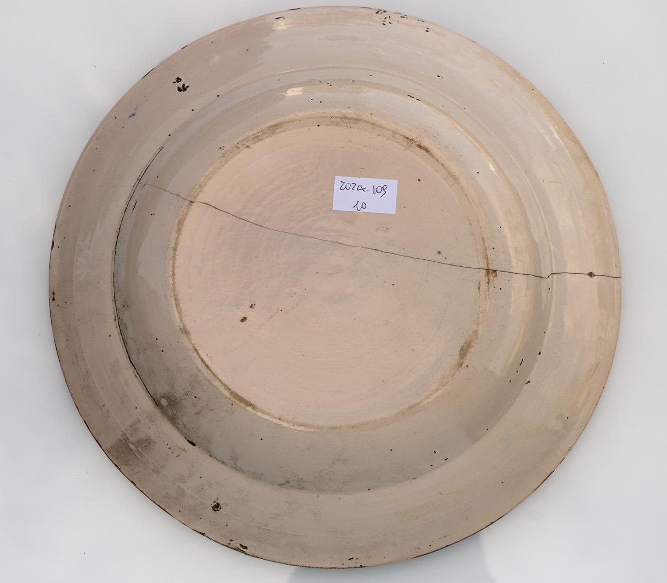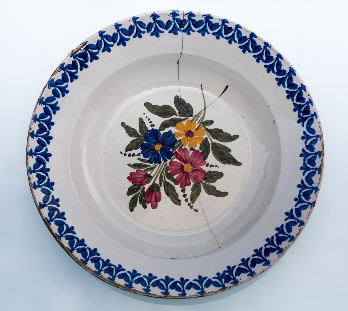 Grande piatto da portata Castelli con fioraccio nel cavetto e decoro a stampino nella tesa Manifattura di Castelli della fine del XIX secolo