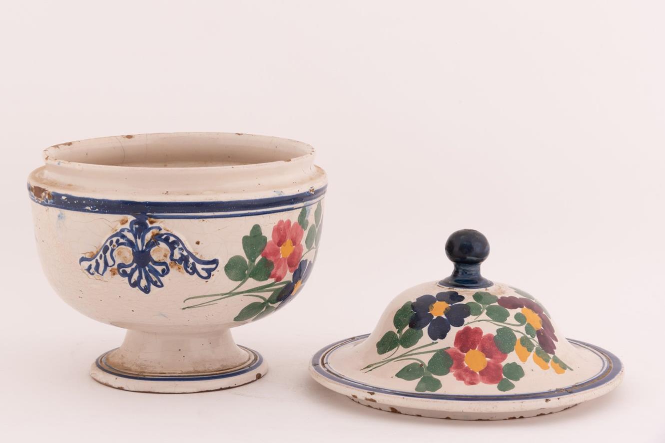 Zuppiera in maiolica decorata in policromia con motivi floreali e bordatura in blu Manifattura castellana del XIX secolo