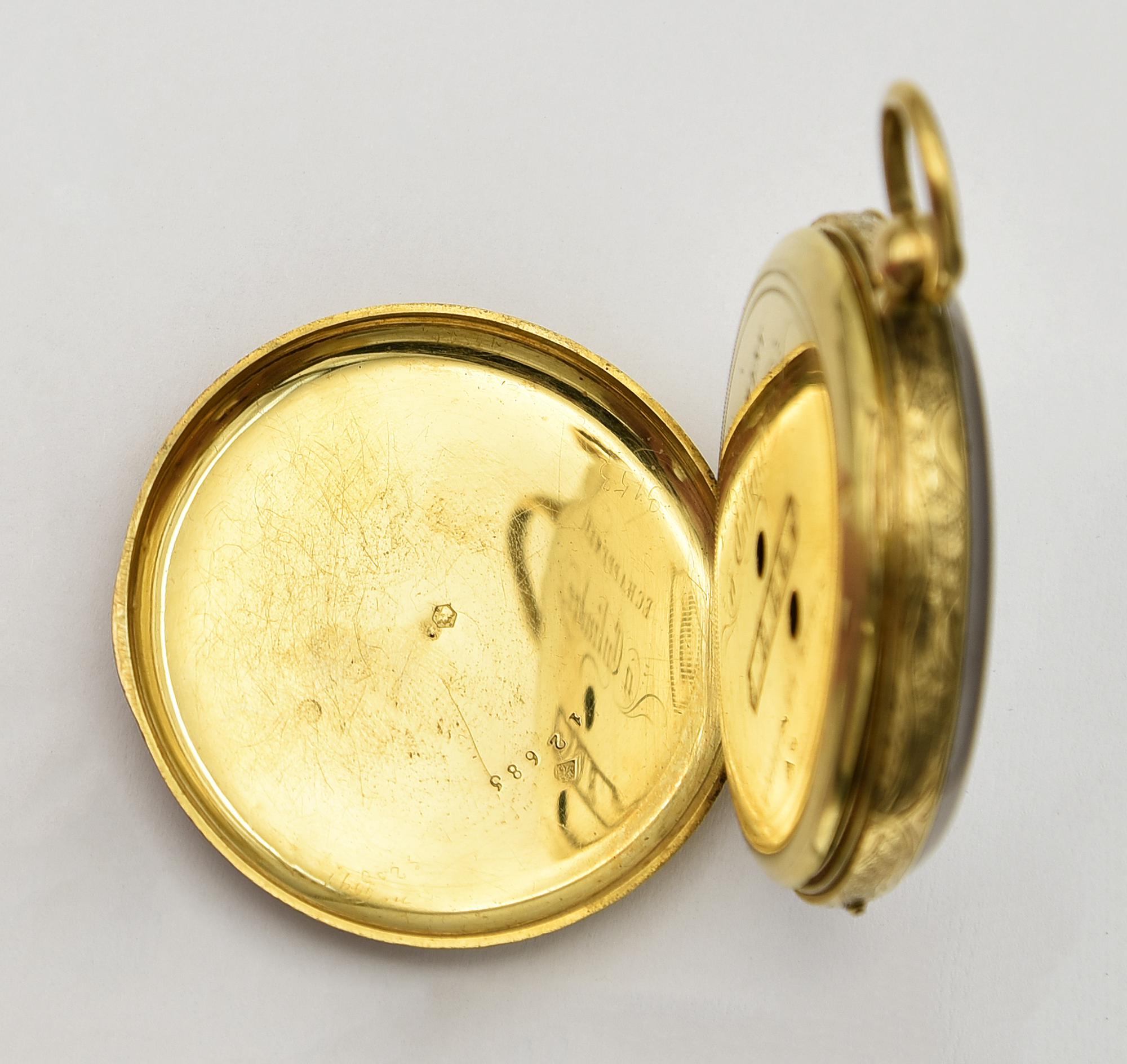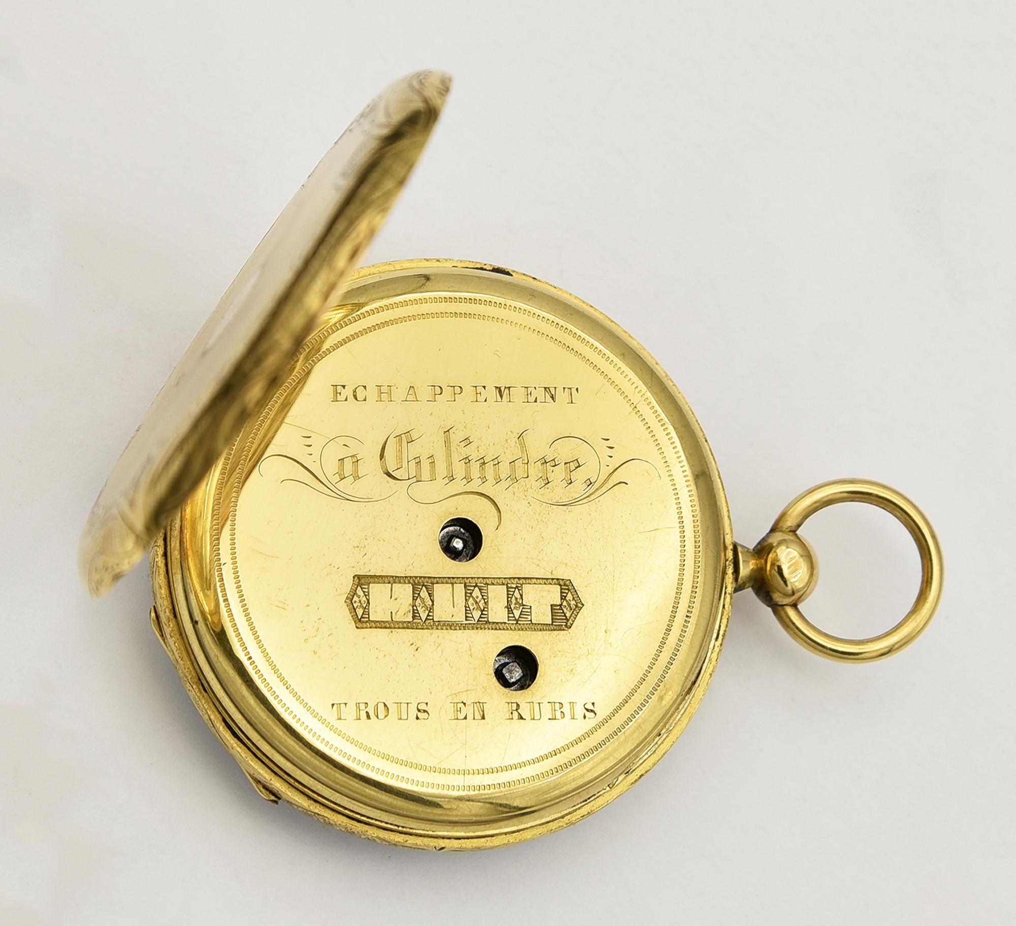 CASSA: in oro 18K con doppio fondello, lavorata a sbalzo e incisione; referenza presente sulla superficie interna del fondello piu' esterno; punzone dell'oro (testa profilo greco) vibile sulla superficie interna di entrambi i fondelli; sulla superficie esterna del fondello piu' interno incisi: "Echappement/a cylindre/Trous en rubis";
