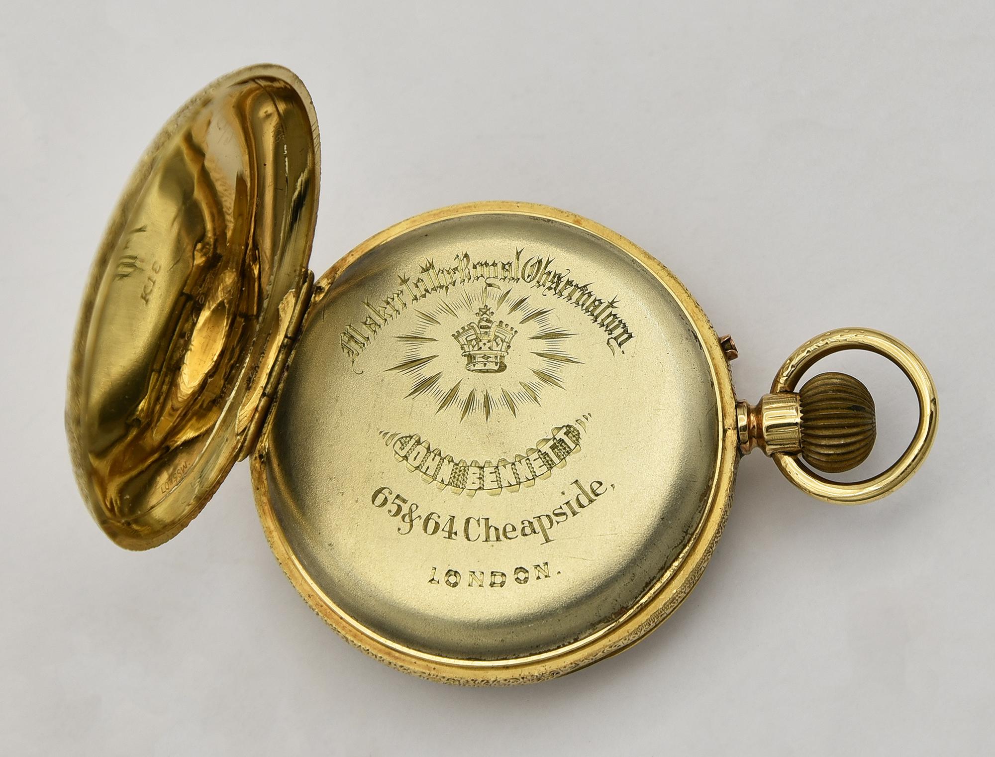 CASSA: in oro 18K lavorata a sbalzo e incisione; referenza visibile sulla superficie interna di entrambi i fondelli; titolo dell'oro presente sullla superficie interna del fondello piu' esterno; sulla superficie esterna del fondello piu' interno inciso: "Maker to the royal Observatory/John Bennet/65&64 Cheapside/London"; referenza visibile anche sulla superficie interna del fondello piu' esterno