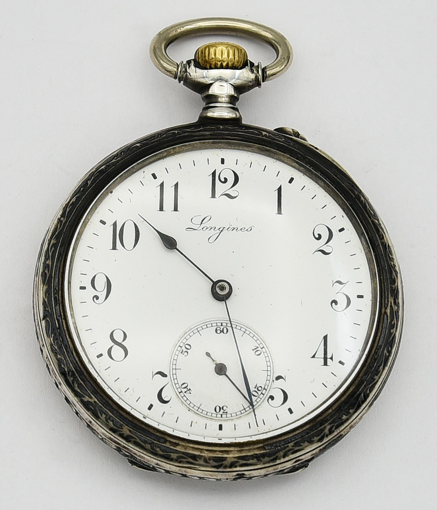 CASSA: in argento lavorata sul retro a sbalzo e incisione; sulla superficie esterna del fondello piu' interno inciso: "LONGINES/GRAND PRIX/PARIS/1900"; referenza, titolo e punzone dell'argento (gallo) visibili sulla superficie interna del fondello piu' interno