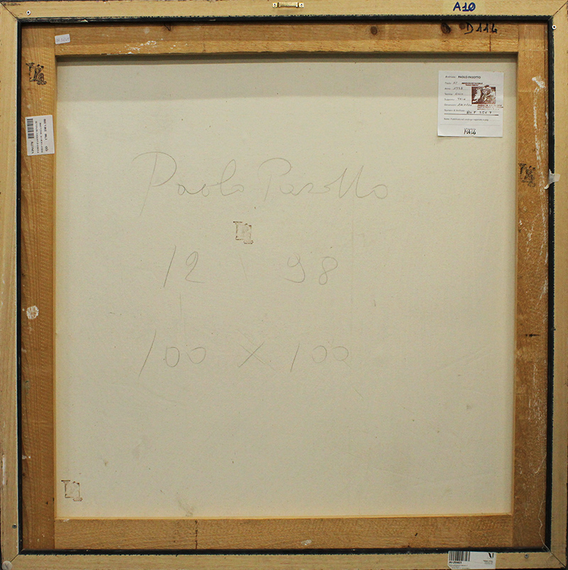 PAOLO PASOTTO, 1998, olio su tela, dim 100x100, opera archiviata dall'Archivio Paolo Pasotto a cura dell'Associazione Culturale "Paolo Friends" al N°80P351T, opera pubblicata sul Catalogo Generale a pag 264. Al verso: al centro firma, data, timbro archivio, dimensioni; timbro archivio in alto a sinistra, in basso a sinistra, al centro a destra, etichetta Archivio paolo Pasotto in alto a destra: titolo, anno, tecnica, dimensioni, numero archiviazioni, pubblicazione, timbro. Opera con cornice