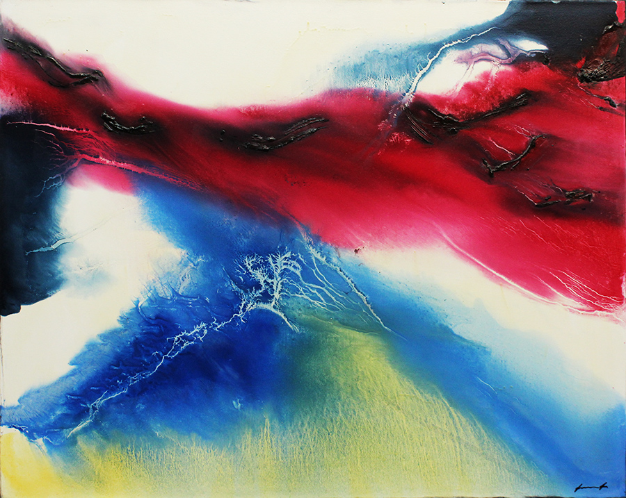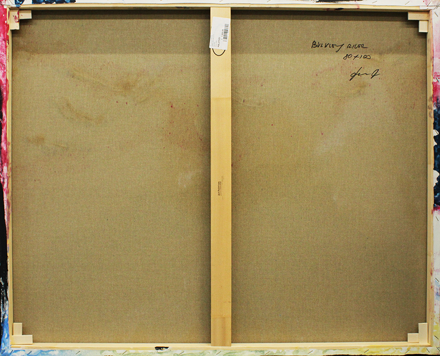PIERLUIGI DE LUTTI, "Bulkley River", 2000, olio e tecnica mista su tela, dim 80x100. Al fronte: firma in basso a destra. Al verso: firma, titolo, anno in alto a destra.