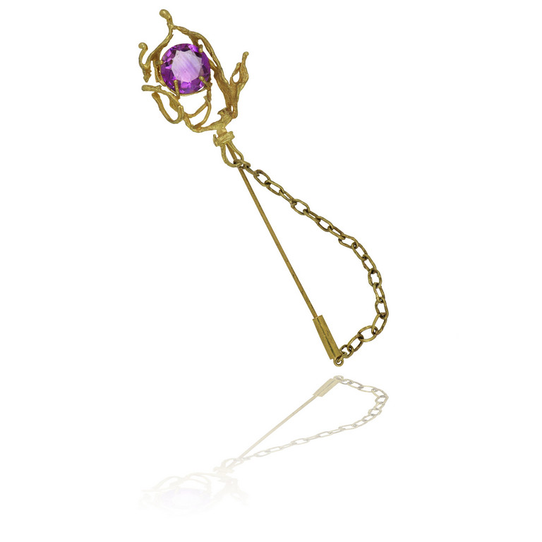 SFORZA Spilla in oro giallo-verde tipico della lavorazione Sforza con incassata ametista rotonda.