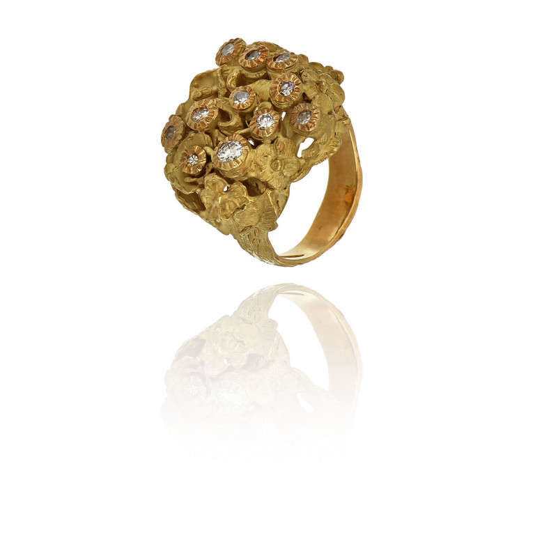 Sforza anello in oro giallo a fascia con motivi floreali della tipica lavorazione a corteccia sabbiata nei fondi e lucida nei piccoli risalti con diamanti taglio 8/8 e brillante.