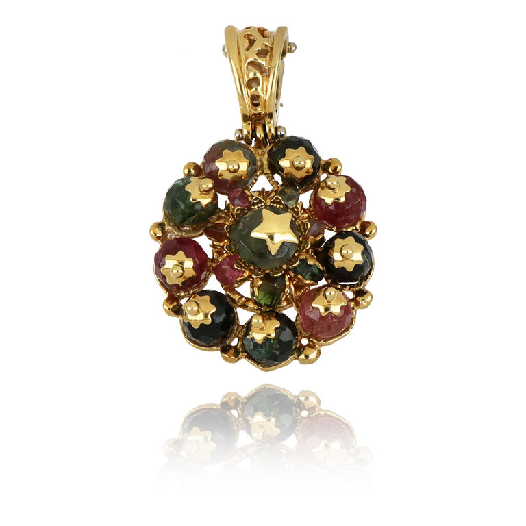 Ciondolo con pietre semipreziose verdi e rosa a briolet realizzato in oro giallo di forma rotonda.