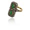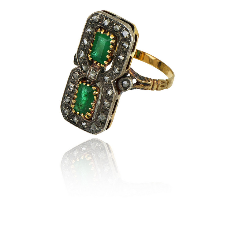 Anello a figaro di forma rettangolare in oro giallo e argento due smeraldi nella parte centrale e diamanti taglio rosa a contorno.