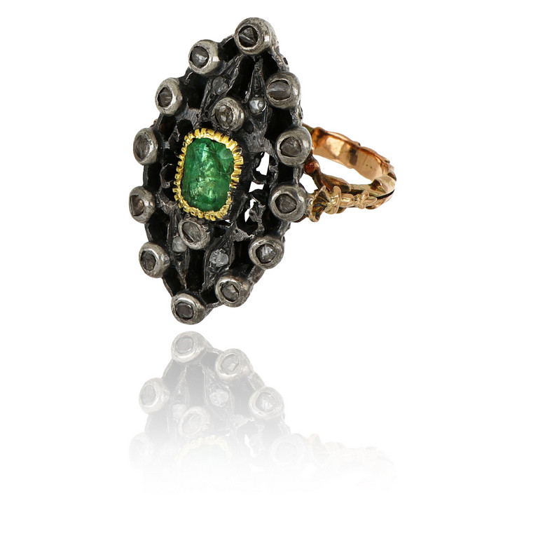 Anello a figaro in oro giallo e argento al centro smeraldo taglio rettangolare e piccoli diamanti taglio rosa a contorno.
