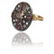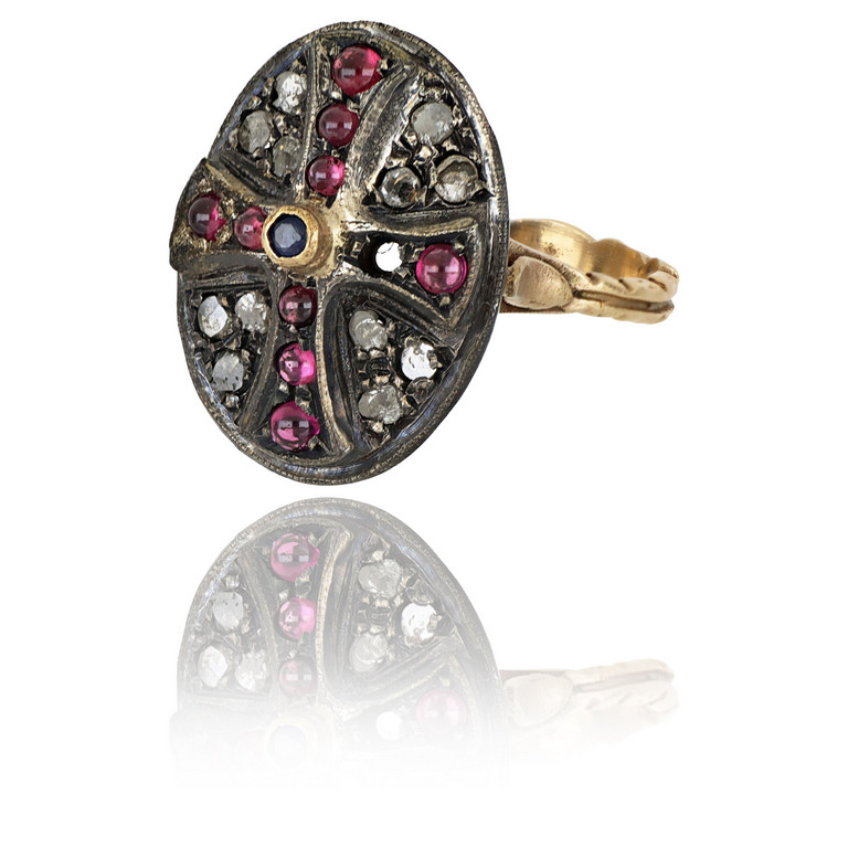 Anello gotico di forma ovale in oro giallo e argento al centro Croce di Malta stilizzata con rubini taglio cabochon piccoli diamanti taglio rosa ai lati.