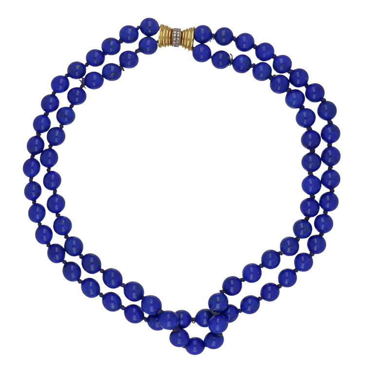 Collana girocollo a doppio filo di sfere di lapislazzuli del diametro medio di 10 mm chiusura in oro giallo e bianco con piccoli diamantini per circa 0 14 ct.