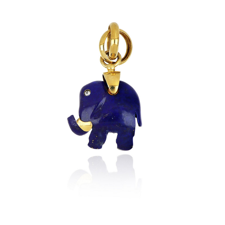 Ciondolo in oro giallo e lapislazuli tagliato a forma di elefante dimensioni 5 x 3 cm.