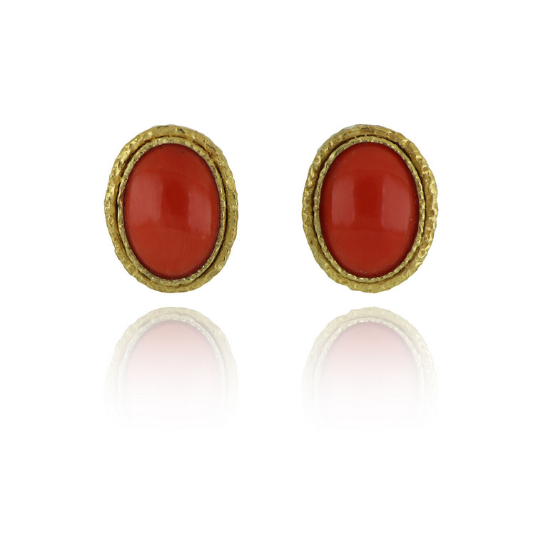 Orecchini in oro giallo SFORZA con corallo rosso aranciato di forma ovale cabochon