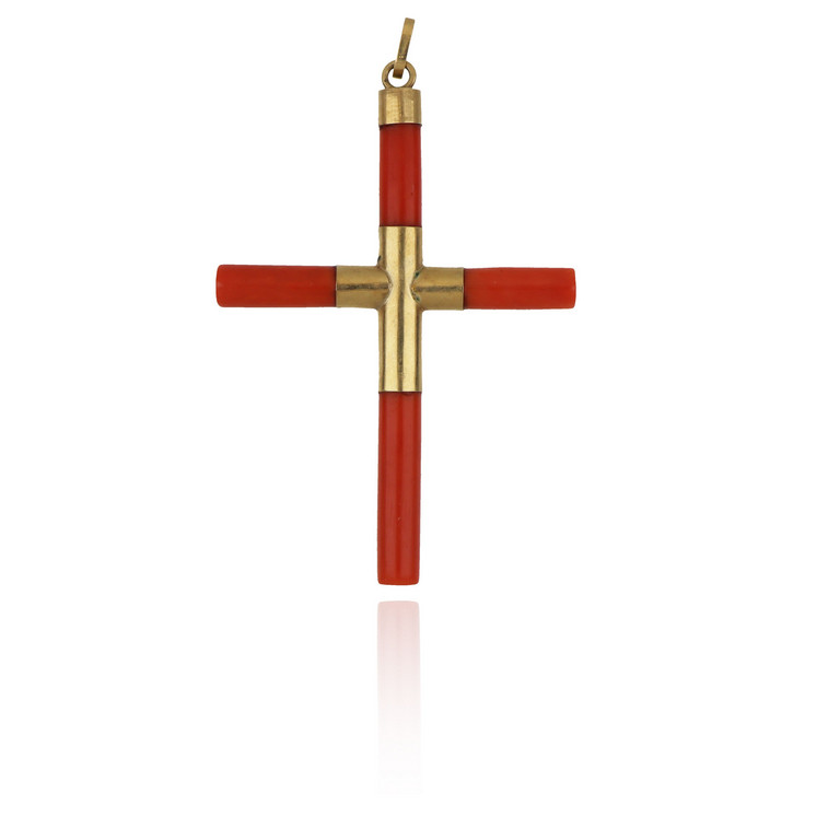 Ciondolo in oro giallo e corallo raffigurante una croce cristiana stilizzata i bracci in corallo a sezione rotonda hanno nella parte centrale rivestimento in oro.