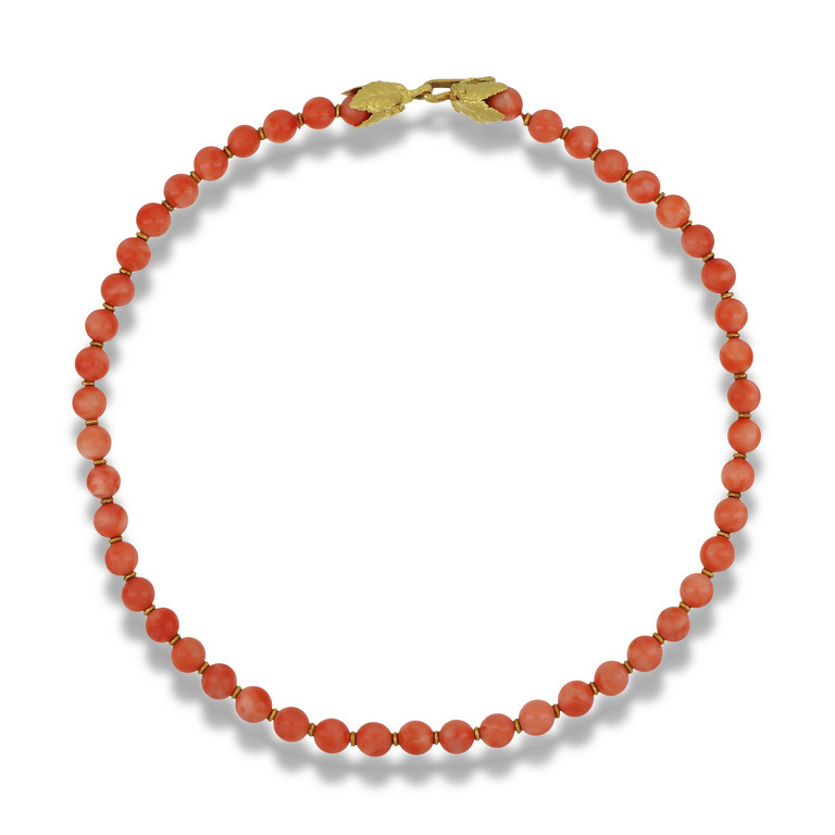 Collana di corallo sferico rosa salmone diametro medio 8 5 mm con intervalli ad anellini d'oro.