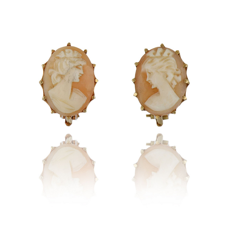 Orecchini in oro giallo a clips con cammeo di conchiglia raffigurante figura femminile con i capelli raccolti.