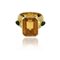 Anello da cocktail con pietre semipreziose in oro giallo con ricca lavorazione in lastra al centro grande quarzo citrino taglio smeraldo due peridoti taglio cabochon a goccia ai lati.