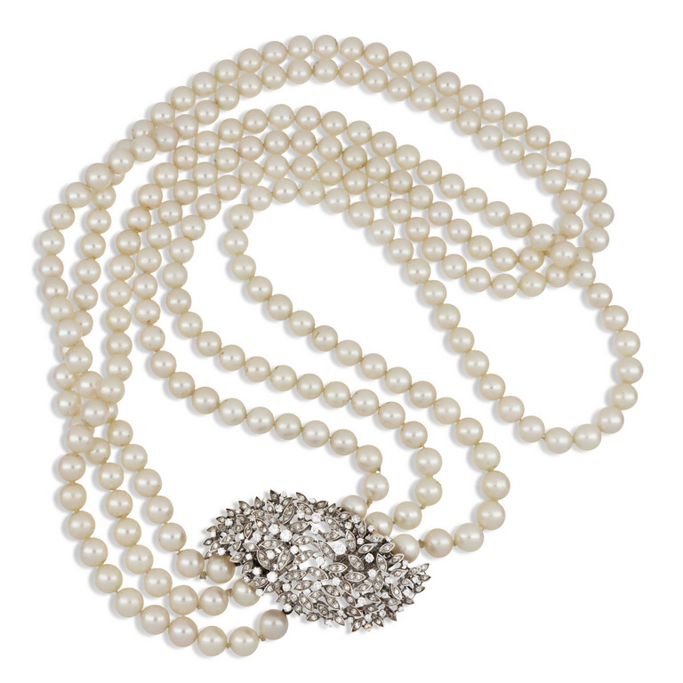 Tre fili chiusi da imponente fermezza in oro bianco a forma di quadrilatero bombato interamente tempestato di piccoli diamanti taglio brillante e 8/8 per stimati ct. 2 5.