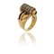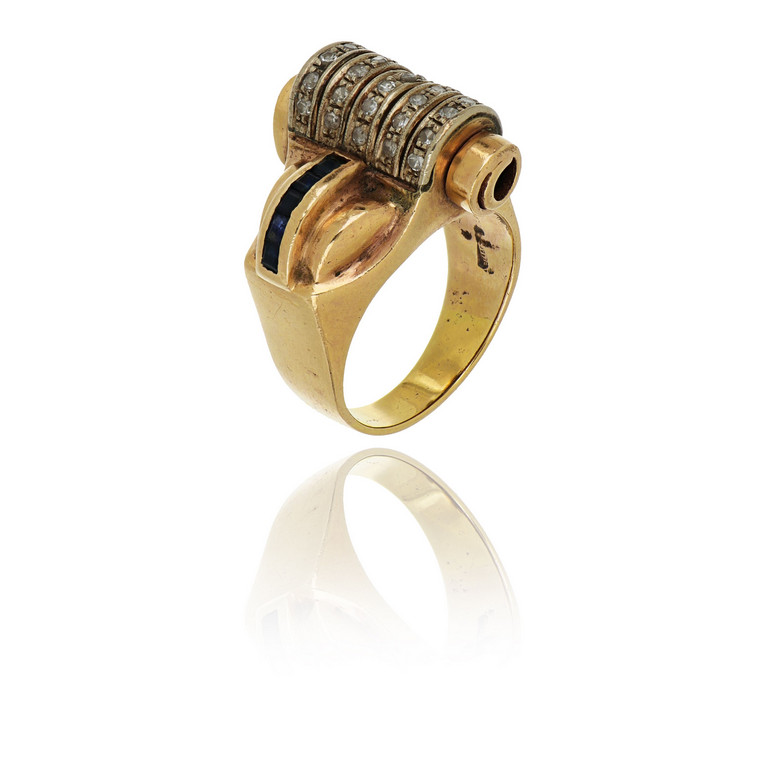 Anello anni 40 in oro rosso con diamanti e piccoli zaffiri carrè.