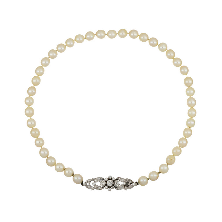 Girocollo di perle coltivate semisferiche (8 mm x 7.50 mm) bella chiusura in oro bianco e diamanti per stimati ct 2.00.