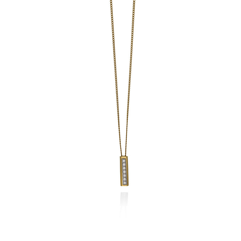 Ciondolo a barretta con piccoli diamanti per circa 0 22 ct con catenina in oro giallo.