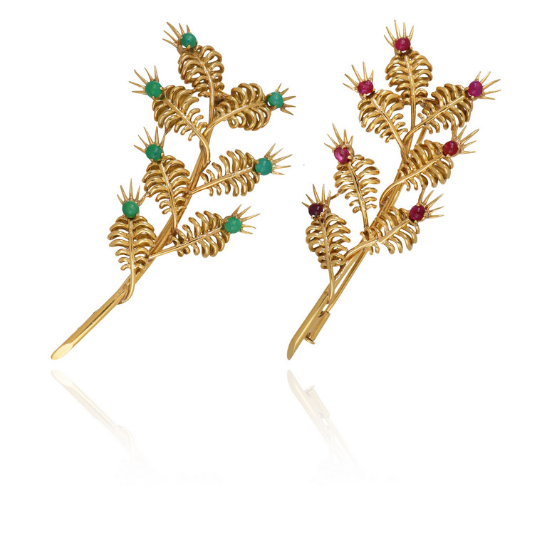 Coppia di spille in oro rosa il motivo a tralcio fiorito e' adornato con piccoli rubini taglio cabochon in una e turchesi nell'altra.