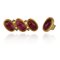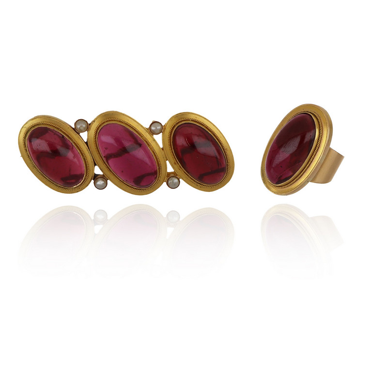 Demi parure composta di anello e spilla in oro giallo realizzati con sobria lavorazione in lastra un grande ovale di granato con taglio cabochon bordato da piccolo cordoncino filigranato e' riproposto 3 volte nella spilla e singolarmente nell' anello.