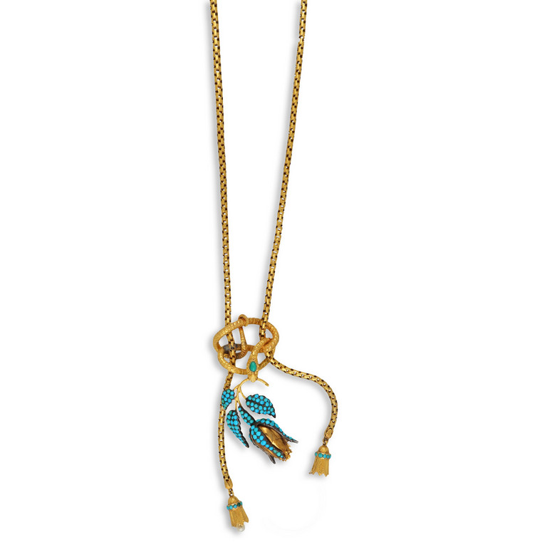 Collana in oro giallo con fine lavorazione di notevole pregio. Motivo a serpente che incontra un fiore ricoperto da piccole semisfere di turchese.