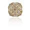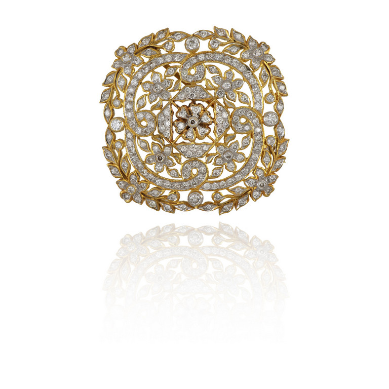 Spilla in oro giallo a rosone con decorazioni fogliari a ghirlanda completamente tempestata di piccoli diamanti e fine lavoro di traforo.