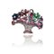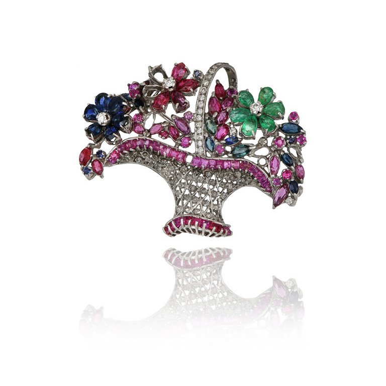 Spilla a cestino di fiori realizzata in oro bianco traforato con pietre preziose di vari colori e tagli alcune mancanti piccoli diamanti.