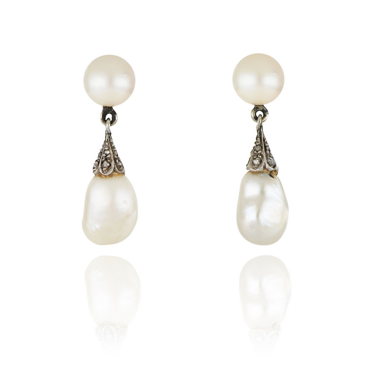 Orecchini d'epoca in oro bianco a due corpi con perno a vite perla in asse di 7 70 mm di diametro e pendente con perla naturale di acqua di mare.