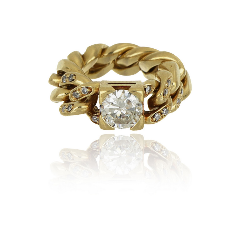 Anello solitario in oro giallo con gambo a groumette diamante centrale di forma rotonda taglio a brillante per circa stimati 1 20 ct.