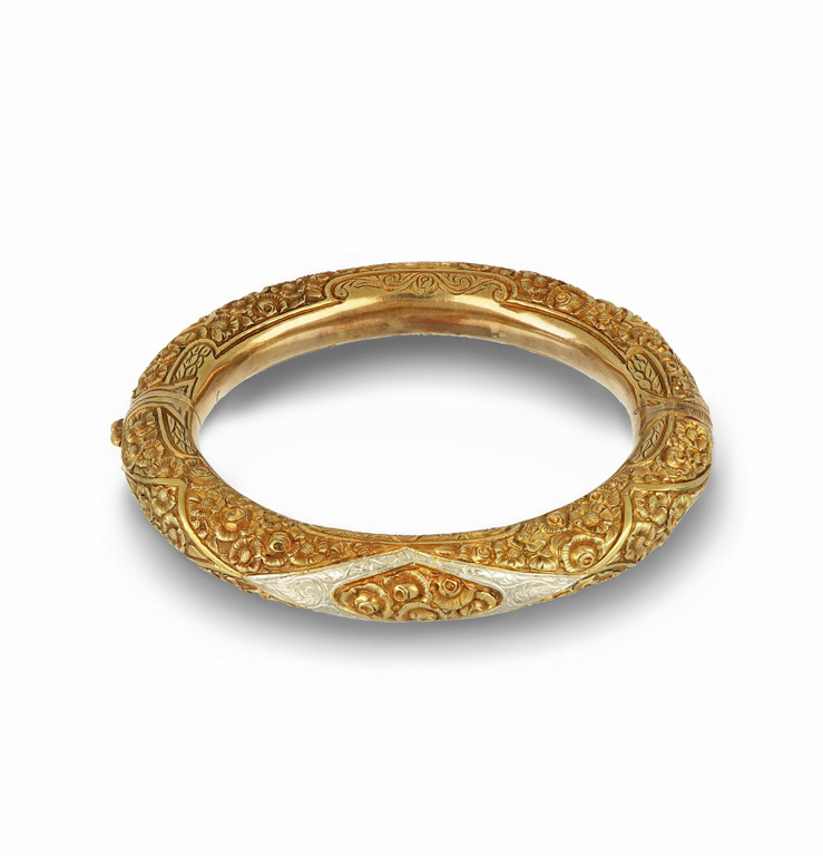 Bangle rigido in oro rosso con apertura a cerniera lavorato a sbalzo su canna vuota decorato con fini ricami floreali di grande dimensione.