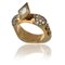 Curioso anello in oro giallo e bianco di forma quadrangolare massiccia al centro e sollevato un diamante taglio a rombo di stimati ct. 0 90 incassato a notte e piccoli altri taglio brillante sulle spallette laterali.