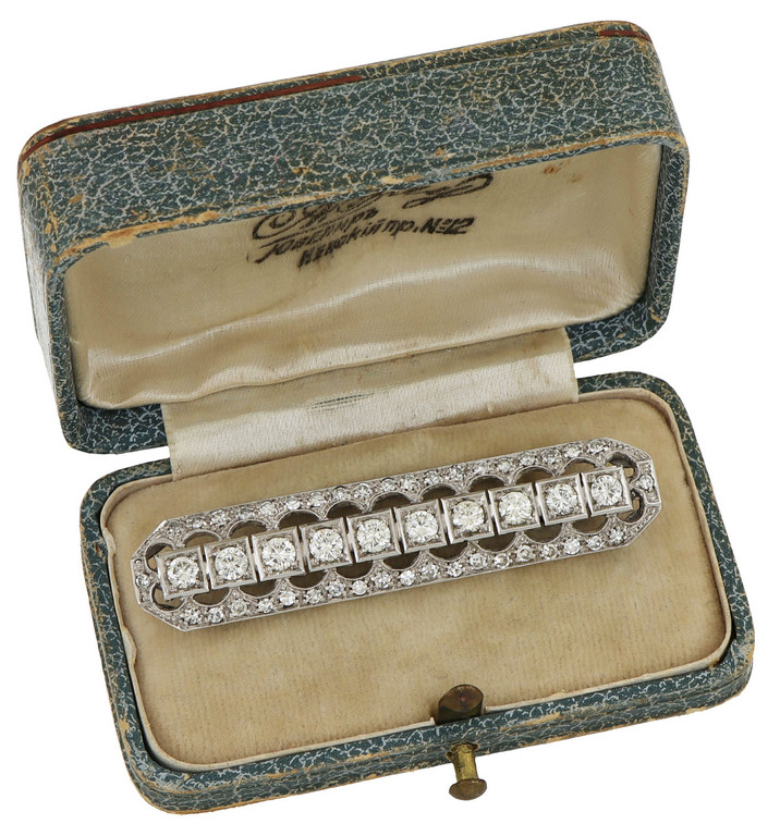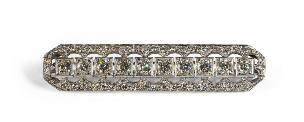 Spilla a barretta in oro bianco 10 diamanti in linea di forma rotonda taglio a brillante al centro e 8/8 su tutto il perimetro per complessivi 2 10 ct circa.