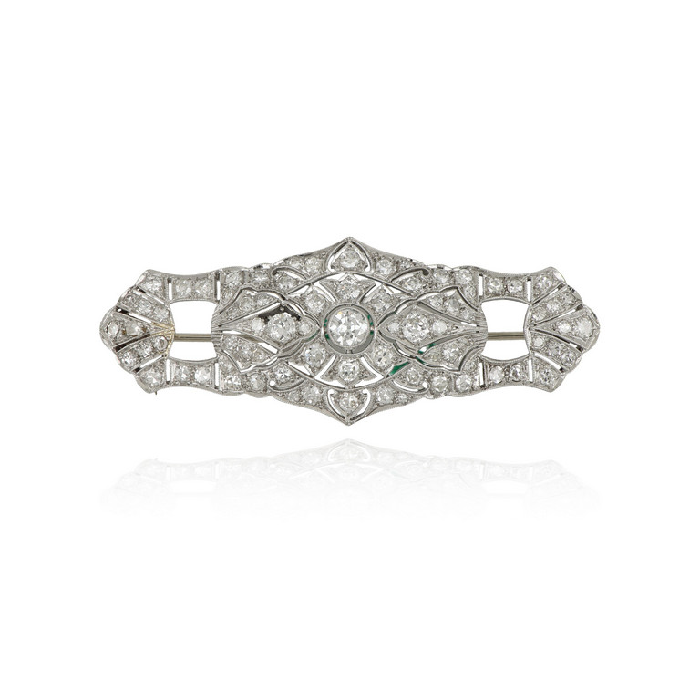 Spilla in platino a saponetta allungata diamanti taglio antico e 8/8 su tutto il gioiello uno piu grande al centro ct. 3 00 ca. complessivi.