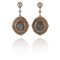 Orecchini pendenti con fine lavorazione Pietre di luna cabochon al centro contorno in quarzo rosa e diamanti micro incastonati sui contorni.