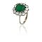 Anello in oro bianco a contorno con diamanti di forma rotonda taglio a brillante per stimati 1 80 ct e smeraldo centrale di circa 4 ct.