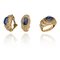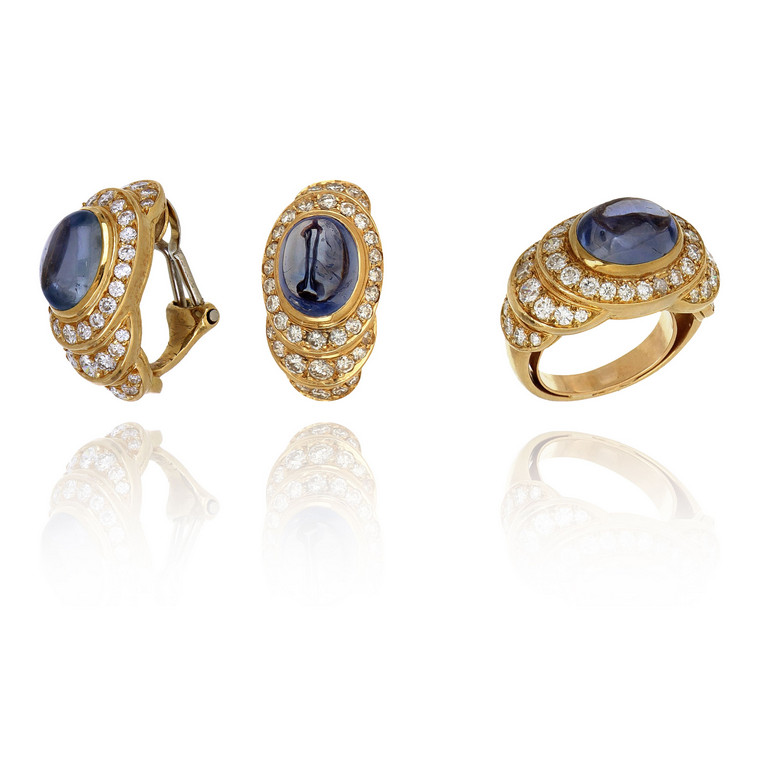 Demi parure in oro giallo composta da orecchini e anello a fascia al centro 3 zaffiri naturali taglio cabochon di stimati ct. 3 50 cad. e diamanti taglio brillante a contorno su 3 livelli per stimati ct. 2 50.