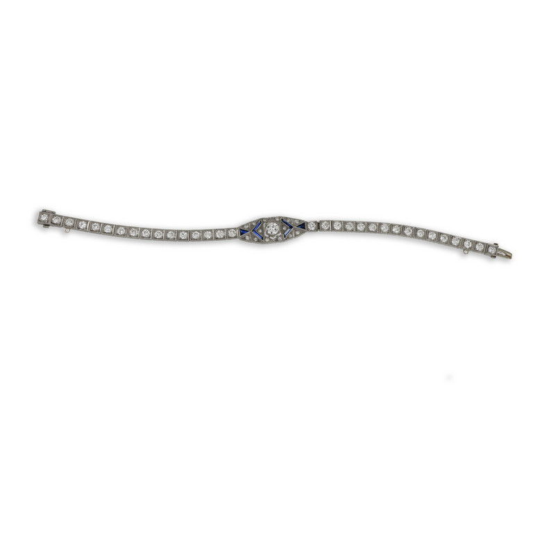 Fine bracciale in platino milligranato nelle incassature e inciso a foglie in tutta la bordatura laterale una linea di 32 diamanti taglio vecchia europa per ct. 3 20 ca. si allarga al centro con un motivo ovale arricchito di piccoli zaffiri taglio baguette triangolo e un diamante piu grande di ct. 0 50 ca.