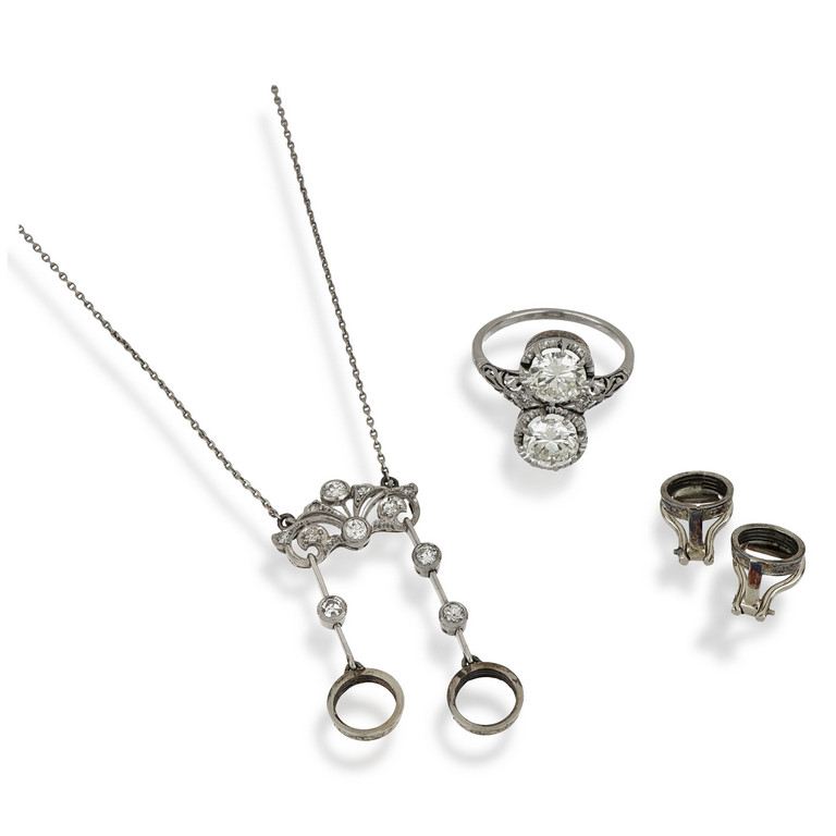 Gioiello componibile in oro bianco con fine lavorazione: due diamanti di forma rotonda taglio a brillante circular cut del peso stimato di oltre 1 ct cad. sono posti su due castoni filettati i quali si possono montare a piacimento rispettivamente su due orecchini a clip su un ciondolo sali-scendi oppure su un elegante anello toi et moi.