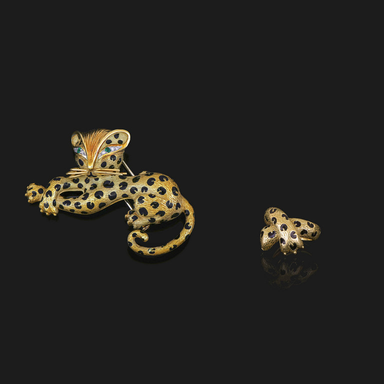 Fred 'demi parure' spilla e anello in oro giallo raffiguranti un felino maculato e due zampe incrociati al dito smalto nero piccoli diamanti e smeraldi.