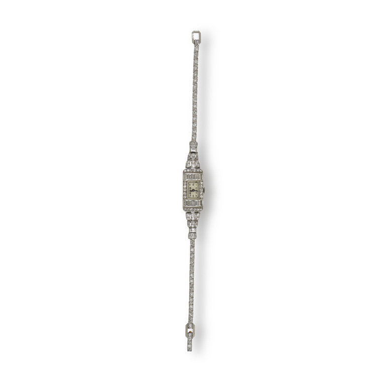 Orologio gioiello lady in platino anni 20 meccanico a carica manuale interamente tempestato di diamanti taglio 8/8 baguette e rose per stimati 2 20 ct complessivi.