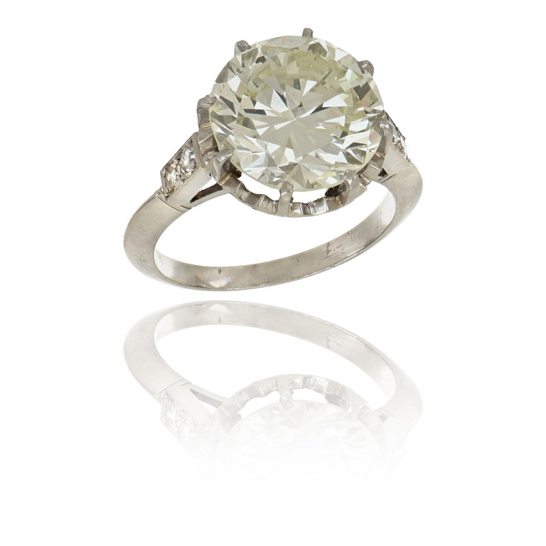 Anello in platino a solitario al centro diamante taglio brillante di stimati ct. 5 40 misure 11 30 x 11 31 x 6 74 fluo lieve colore stimato M purezza vs 4 altri taglio 8/8 sul gambo.