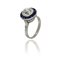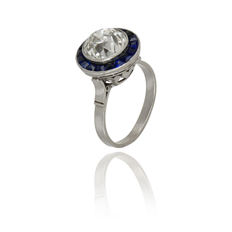 Anello ad halo in platino con diamante di taglio antico di stimati 4 ct circa e contorno di zaffiri carrè.