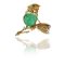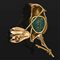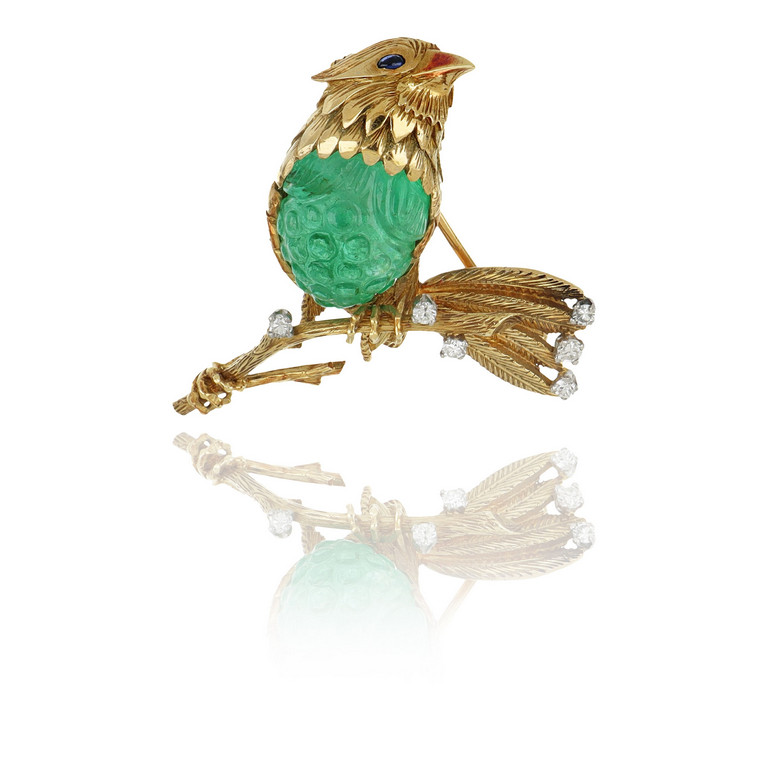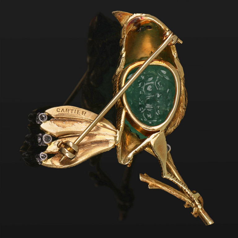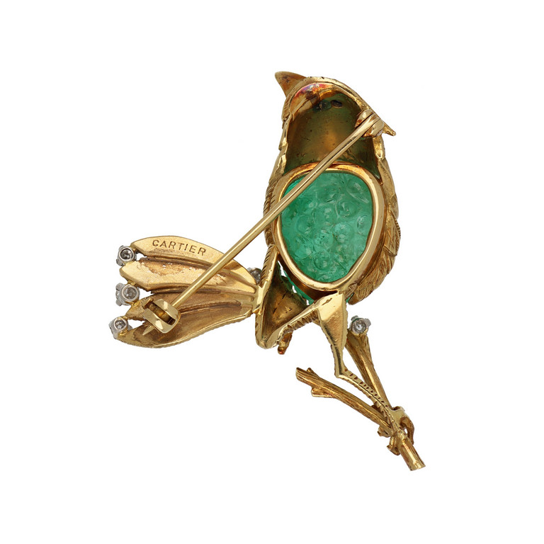 CARTIER - Rara ed importante spilla in oro giallo 1960 circa raffigurante un uccellino pettirosso su tralcio di ramo il corpo è rappresentato da uno smeraldo colombiano carved di stimati 15 ct. Completano sei piccoli diamanti per circa 0 15 ct e l'occhio con un piccolo zaffiro cabochon.
