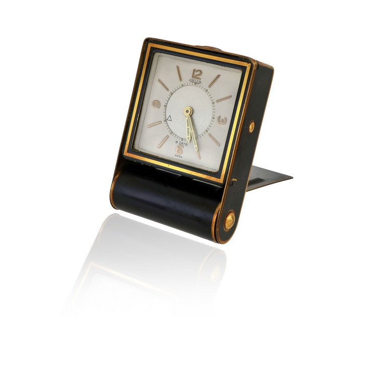 Jaeger sveglietta da viaggio in metallo dorato e verniciato movimento meccanico con riserva di carica di 8gg suoneria e sfere luminescenti.