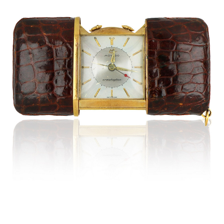 Movado orologio da viaggio con suoneria in metallo dorato e rivestito in pelle.