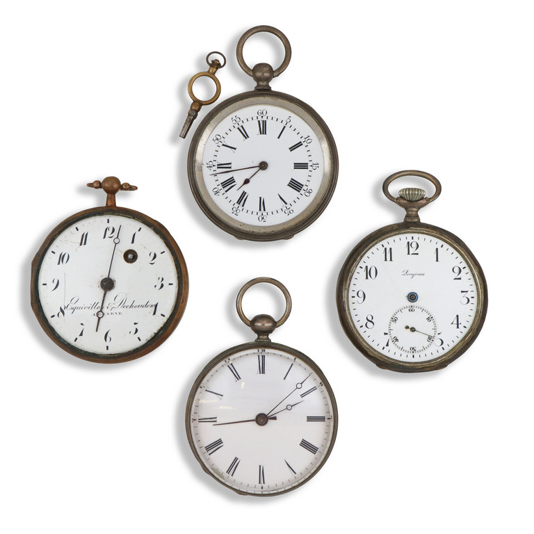 Lotto composto da 4 orologi d'epoca da tasca in argento due anonimi un Longines privo di sfere e vetro uno firmato Esquivillon & Dechoudens.