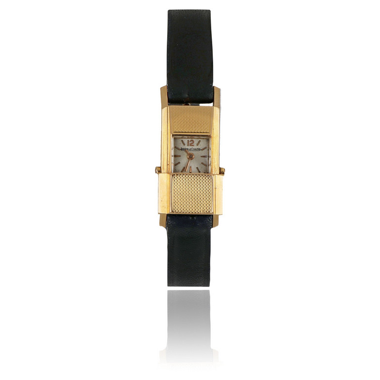 Jaeger LeCoultre raro orologio da donna in oro rosso movimento meccanico carica manuale con ghiera sotto cassa quadrante a scomparsa a slitta superficie godronata solo tempo.